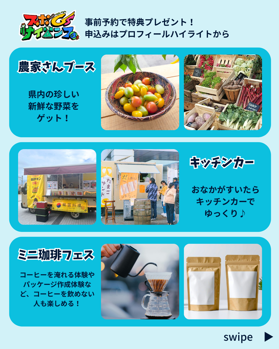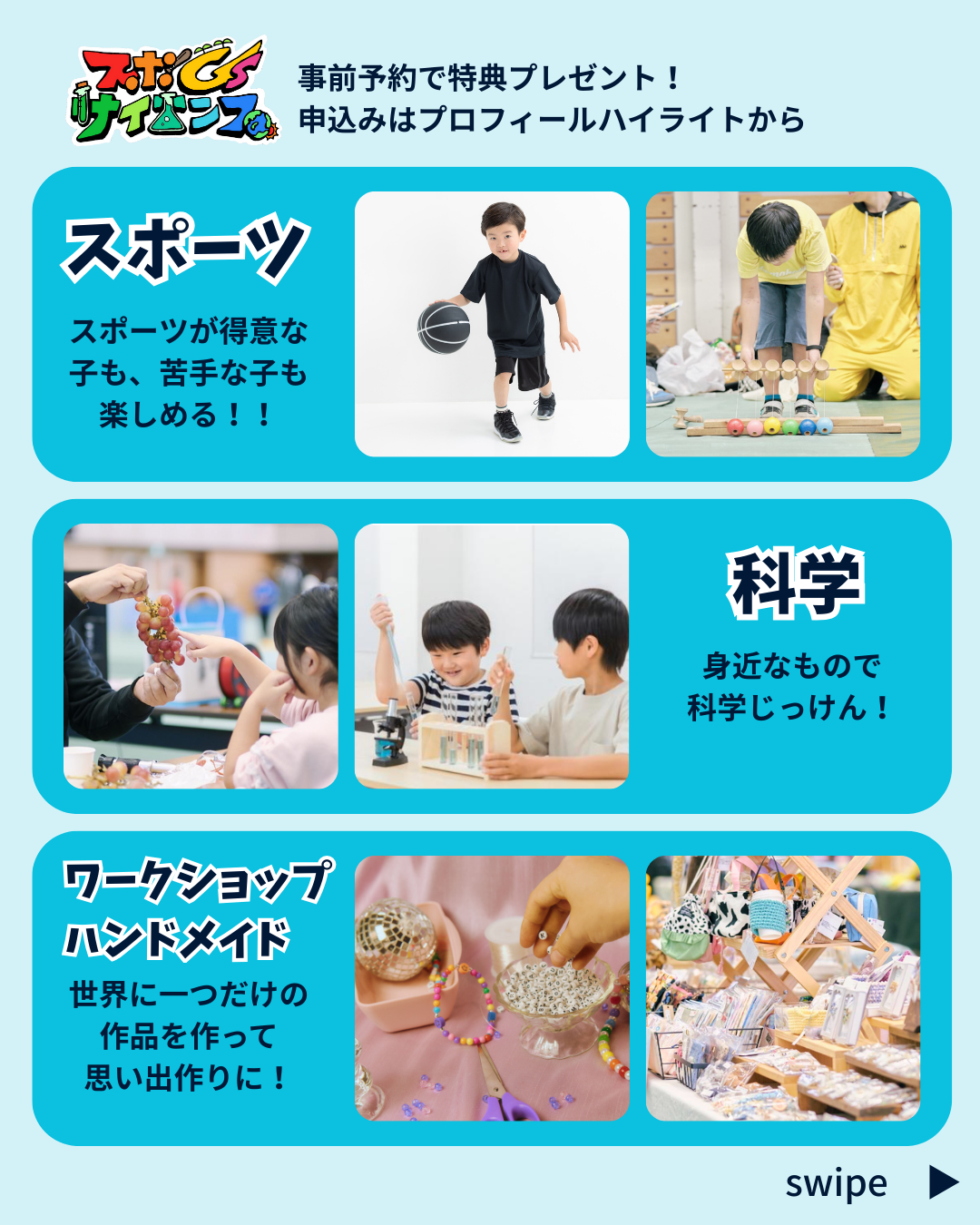 会場では、スポーツ体験や科学実験をはじめ、SDGsを学べるワークショップ、ハンドメイド雑貨の販売、キッチンカーや農家さんのブースなど多彩なプログラムをご用意。