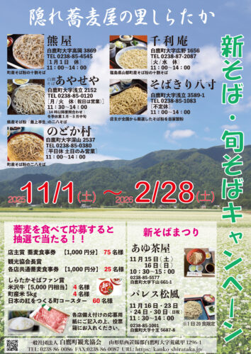 【山形イベント情報11/1-2/28】隠れ蕎麦屋の里しらたか新そば・旬そばキャンペーン(白鷹町)