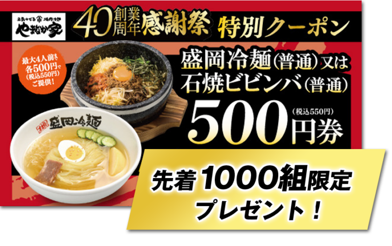 期間中に来店した方には、各店舗先着1,000枚限定で「盛岡冷麺または石焼ビビンバ 500円特別クーポン券」のプレゼントもあるそうです!