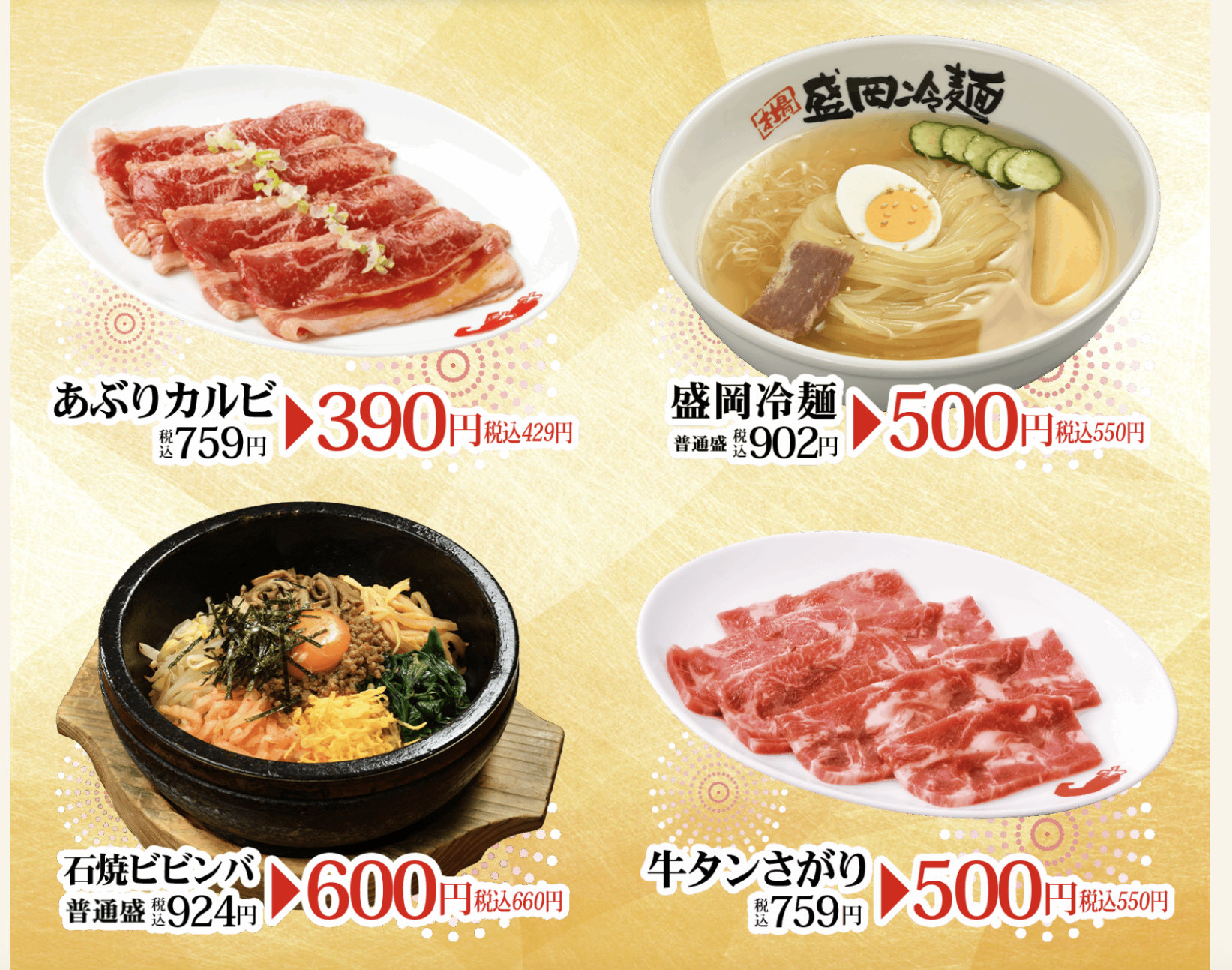 看板商品の「盛岡冷麺」や「あぶりカルビ」など、やまなか家自慢の味が驚きの感謝価格で楽しめちゃいますよ。