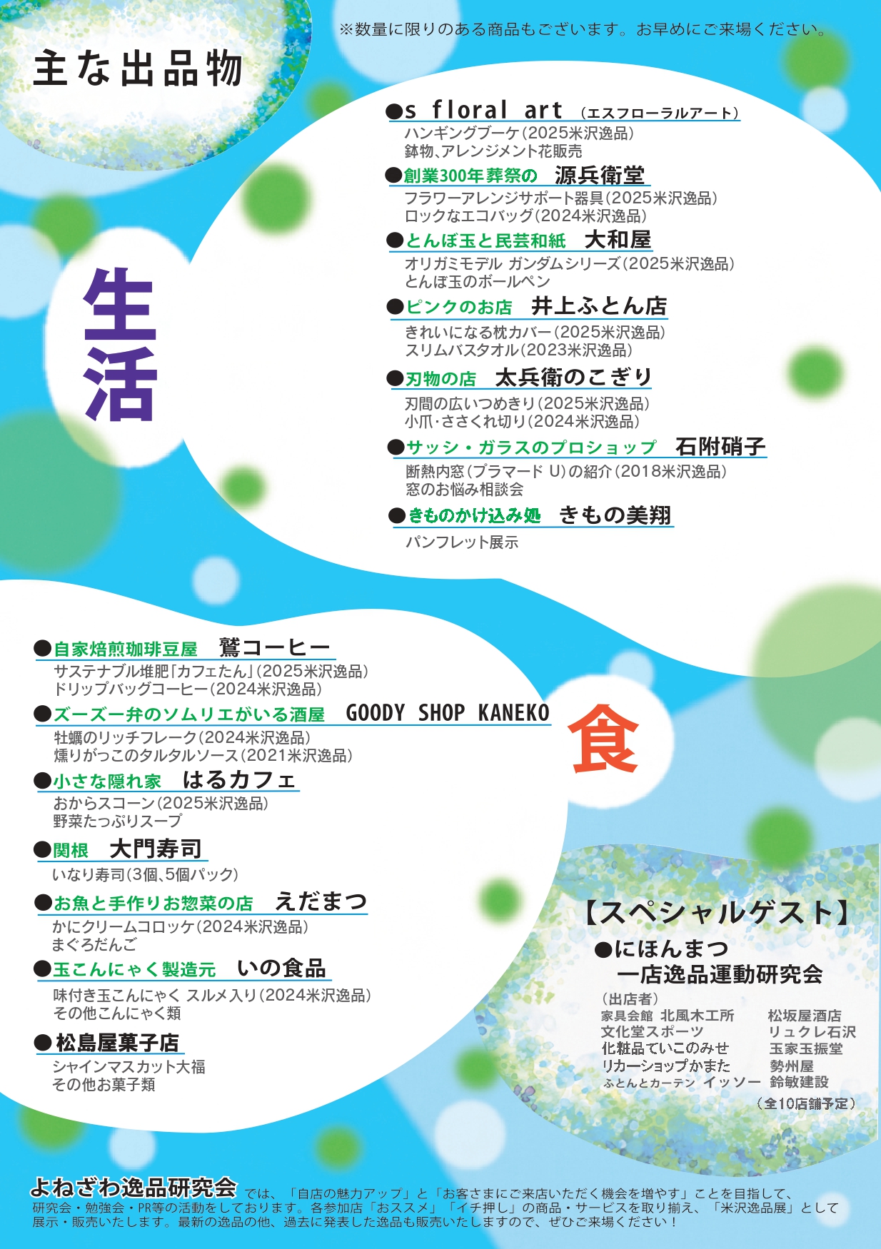 内容:①よねざわ逸品研究会参加店の「米沢逸品」の展示・販売