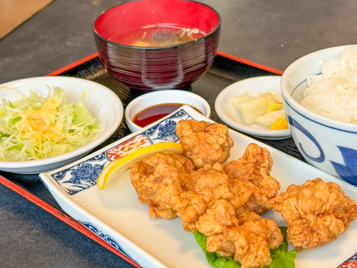カラッと揚がった唐揚げにごはん、みそ汁、サラダ、お新香などが付いてこちらもなかなかのボリューム感です。
