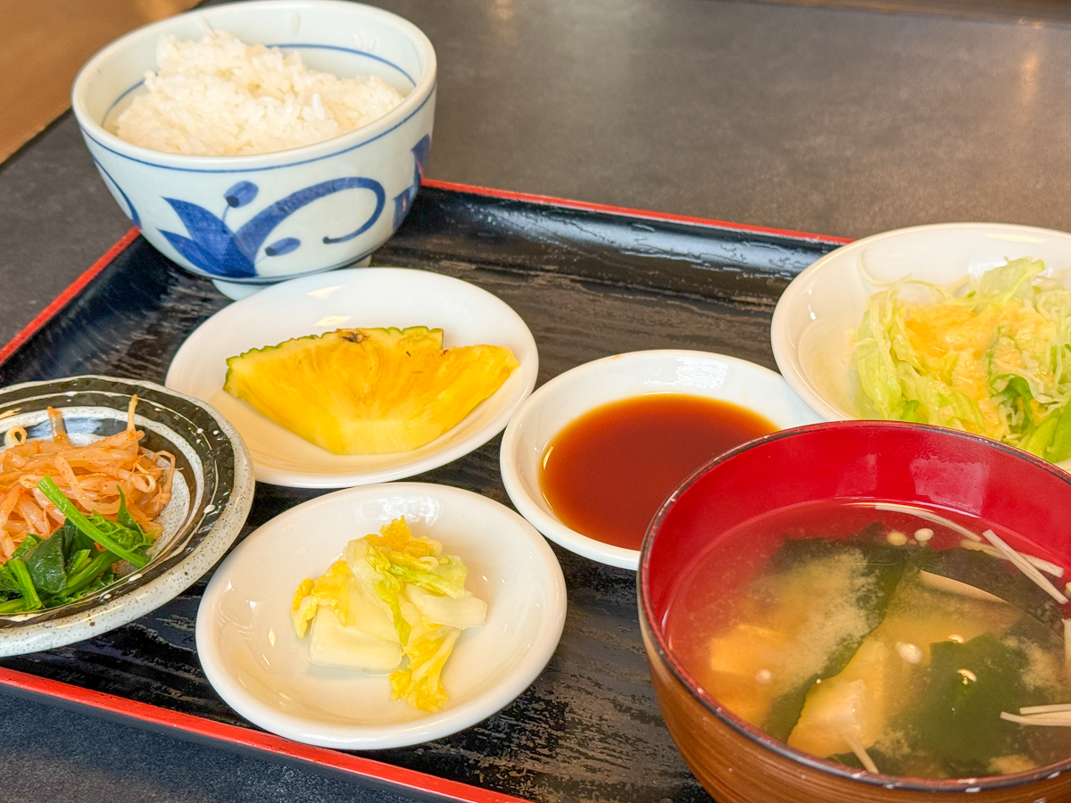 お肉のほかに、ごはん、みそ汁、サラダ、お新香、小鉢、フルーツまで付いています。