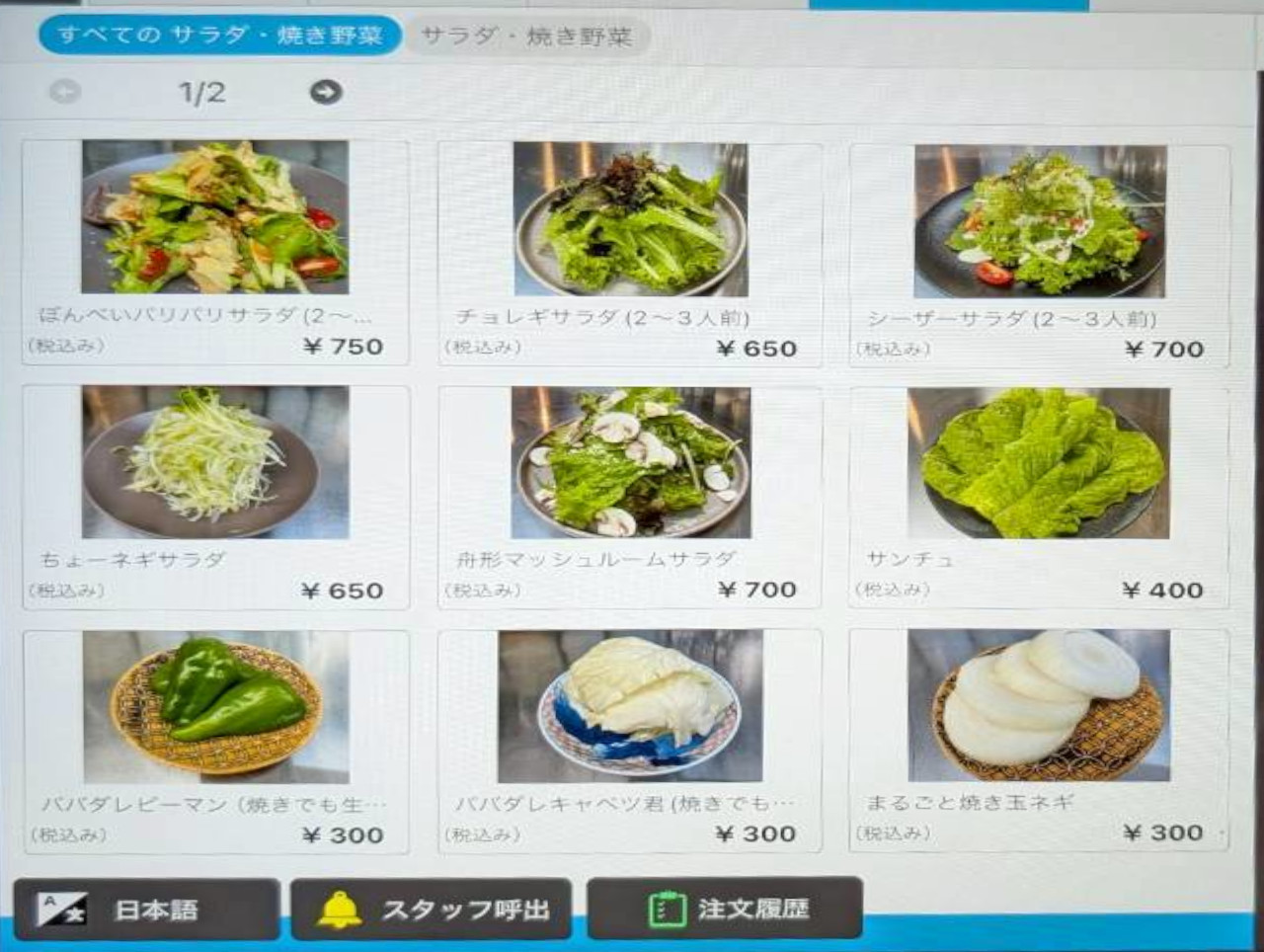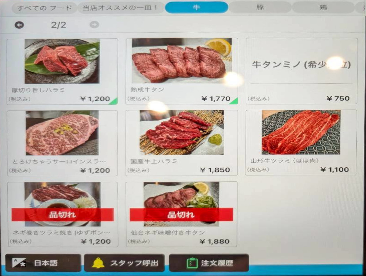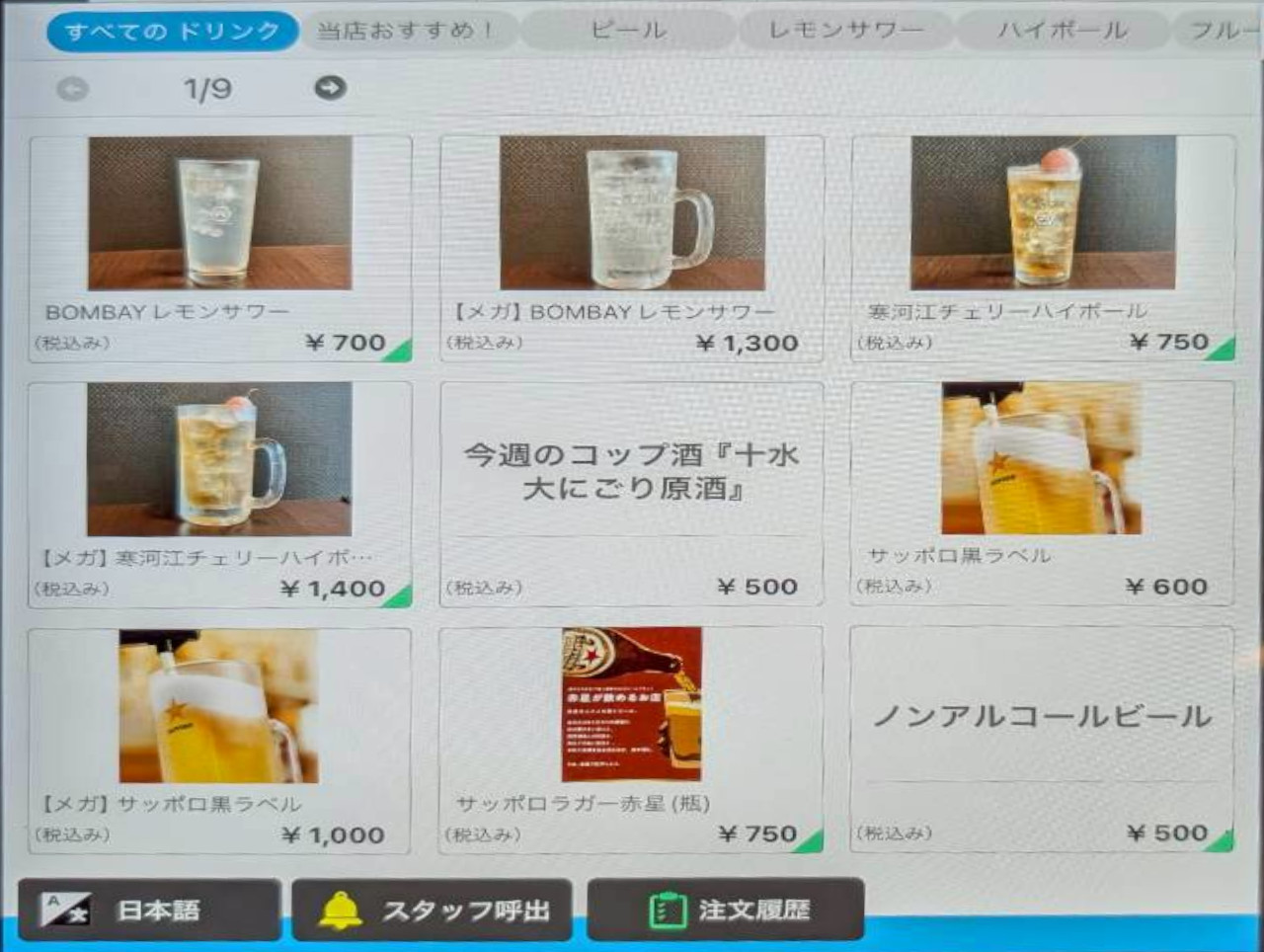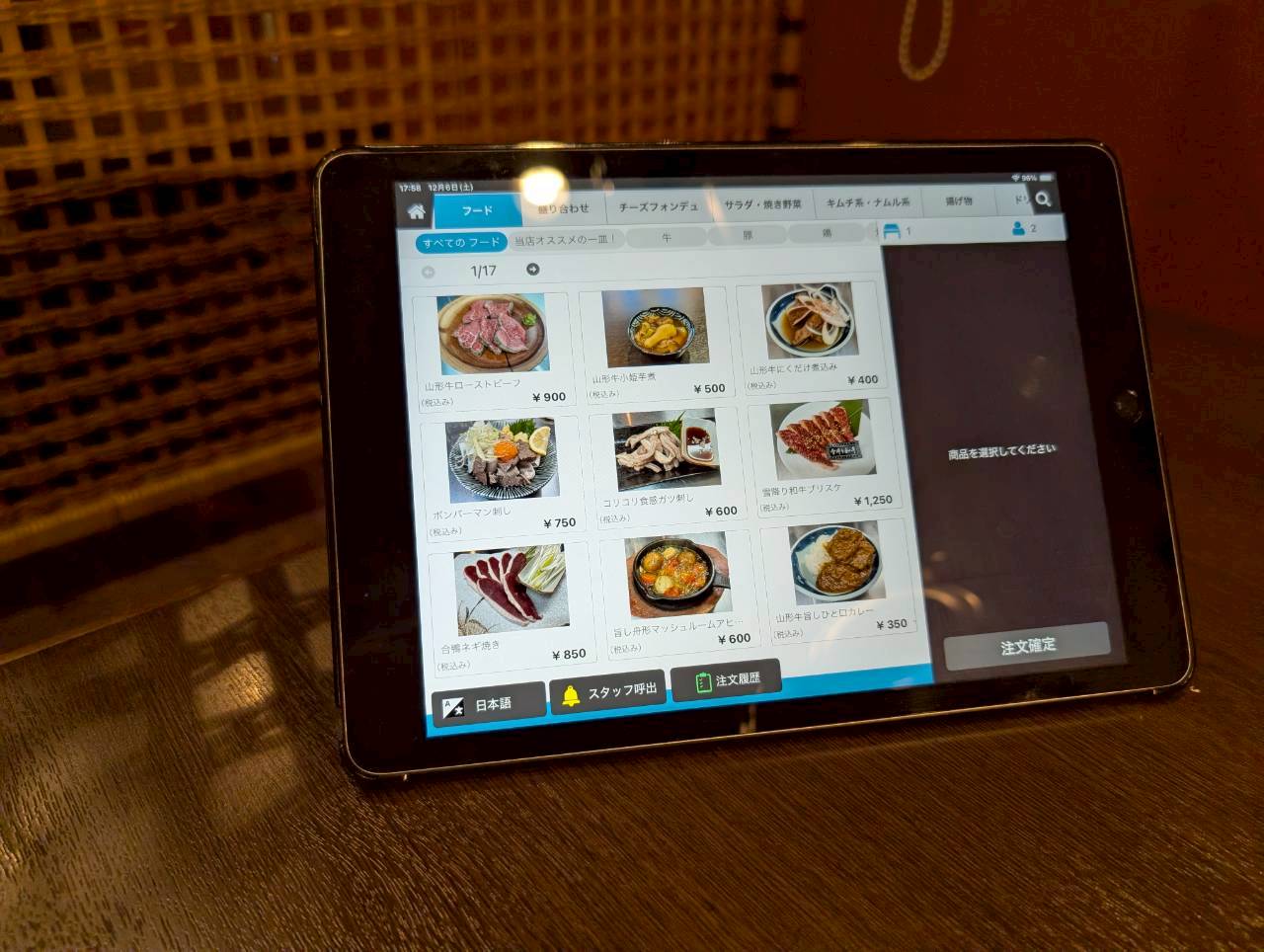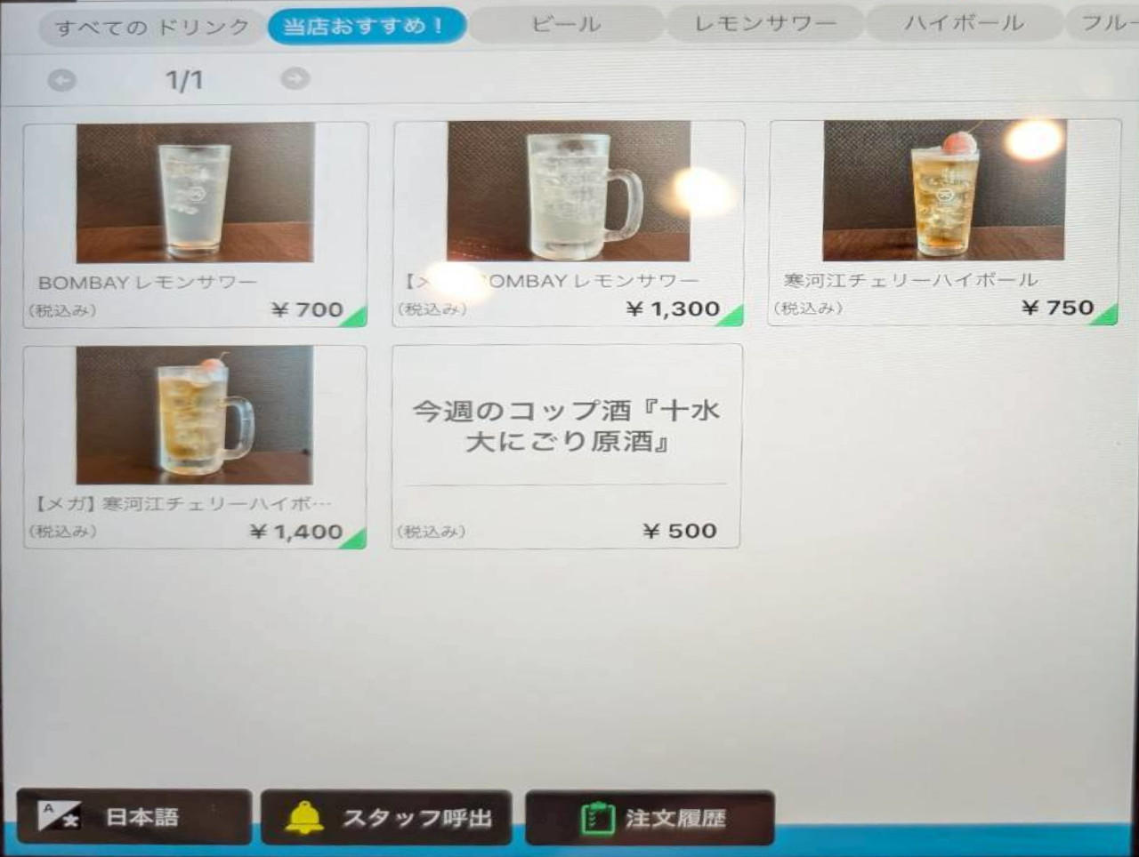 テーブル備え付け品は、メニュー、楊枝、タブレット、