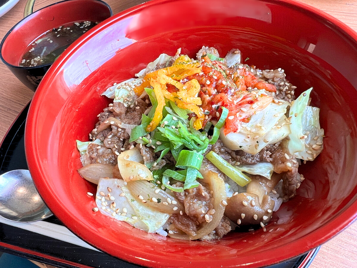 しっかりと味付けされた牛カルビを玉ねぎや野菜、ご飯と合わせて食べると絶妙な味付けになって美味しい!