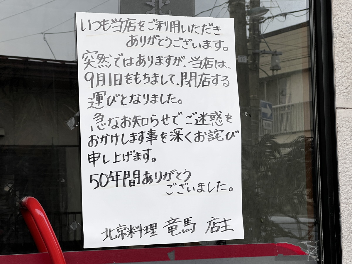 「北京料理 竜馬」さんが2025年9月1日に閉店しました。