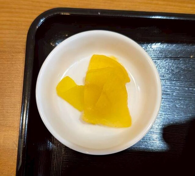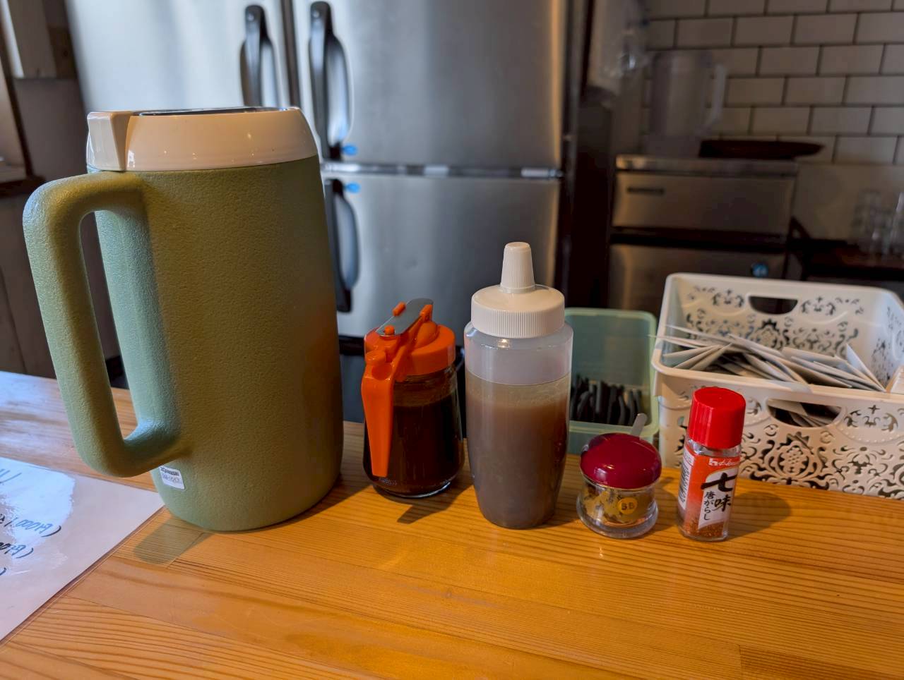 テーブル備え付け品は、お品書き、七味唐辛子、ドレッシング、とんかつソース、辛子です。