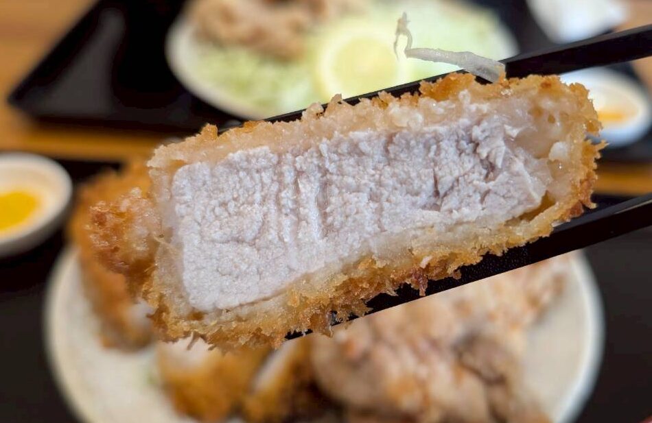 シッカリ中まで加熱された厚手の豚肉を薄目の衣が覆っています。