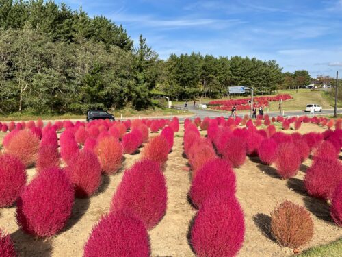 酒田市にある「庄内夕日の丘オートキャンプ場」の入り口近くにあるコキアは、秋になると真っ赤に色づきます。