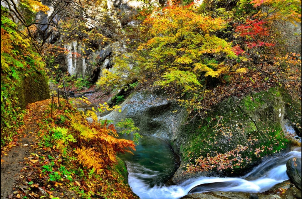 山形県と宮城県の県境にある「面白山」のふもとには、紅葉の名所「面白山紅葉川渓谷」があります。