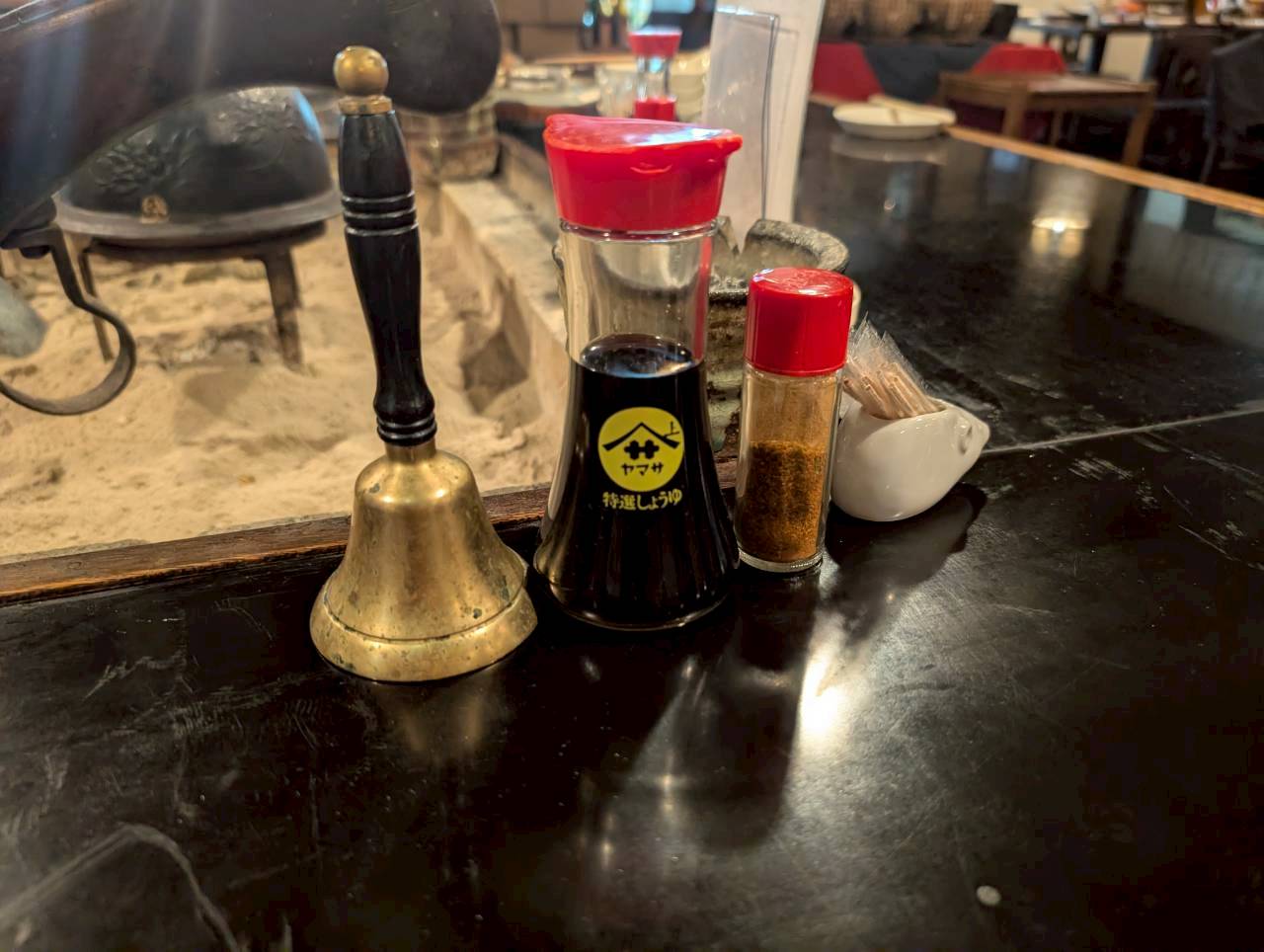 テーブル備え付け品は、七味、醤油、楊枝、灰皿、ハンドベルです。
