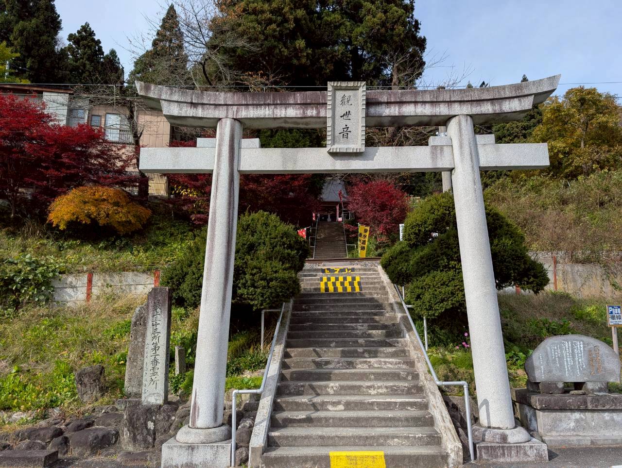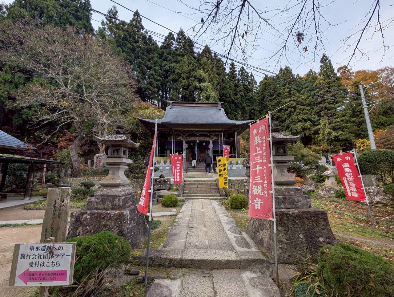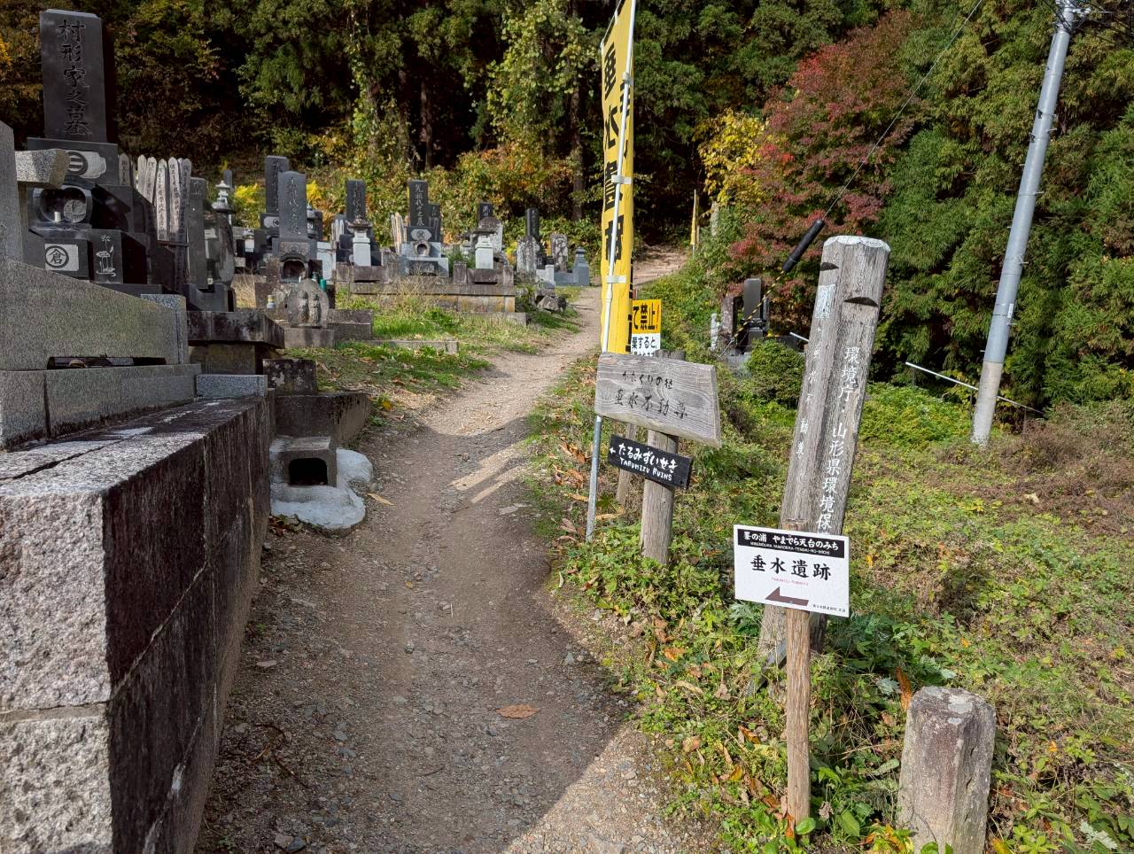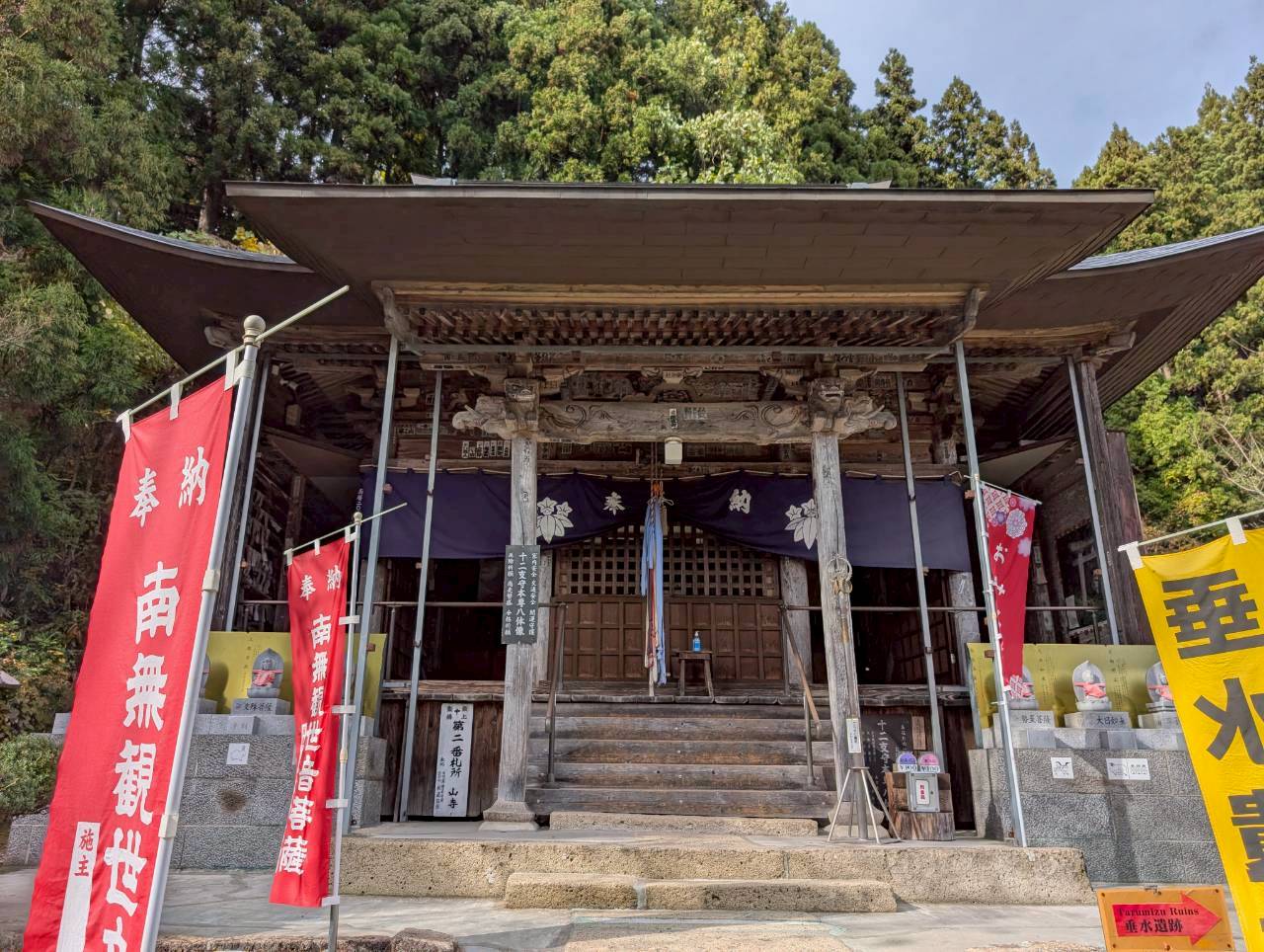 一方、表題にある垂水遺跡(たるみずいせき)をご存じでしょうか。こちらも山寺地区にあるのですが、初耳の方も多いと思います。場所は立石寺よりさらに奥に進み、最上三十三観音の二番札所でもある千手院の裏手にあります。