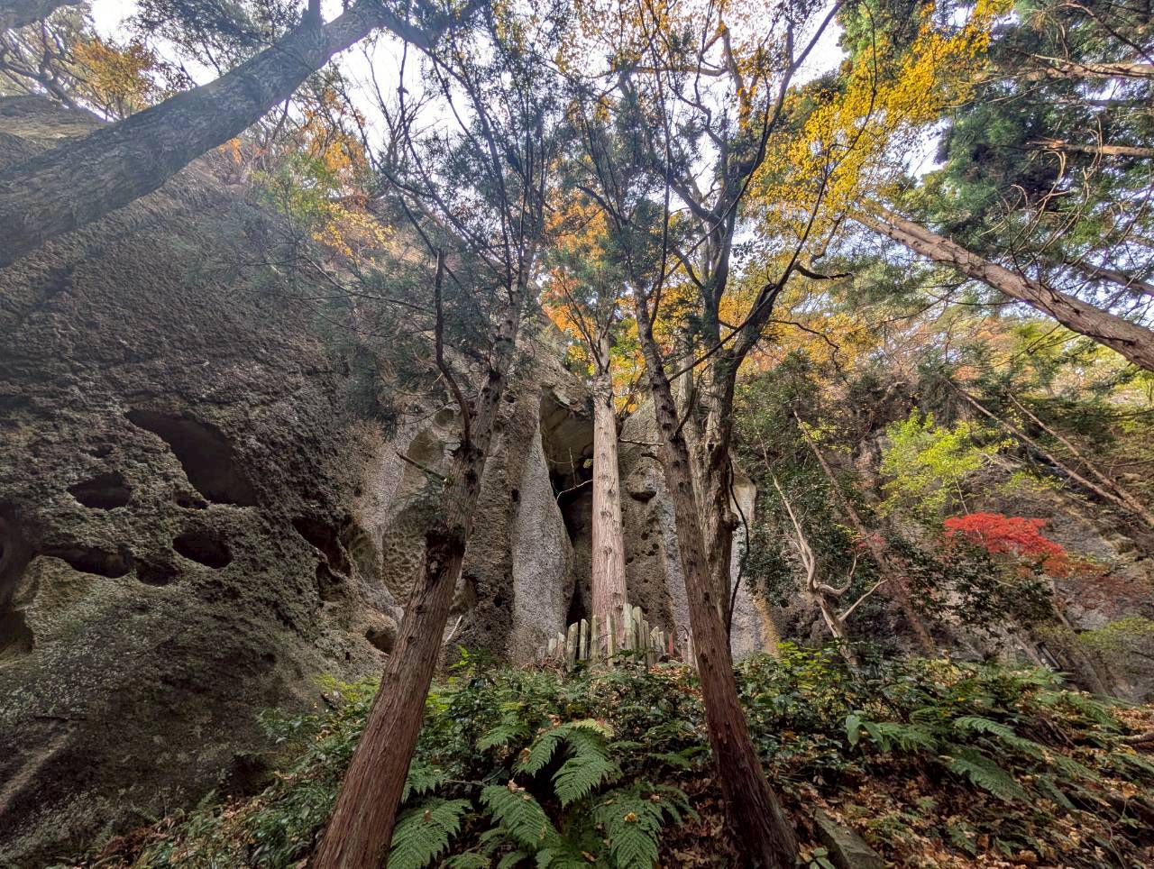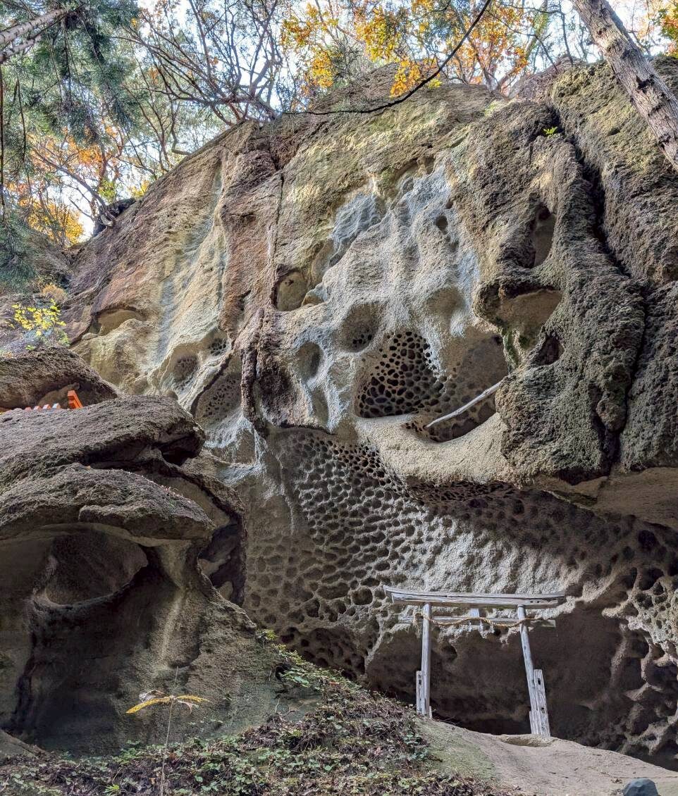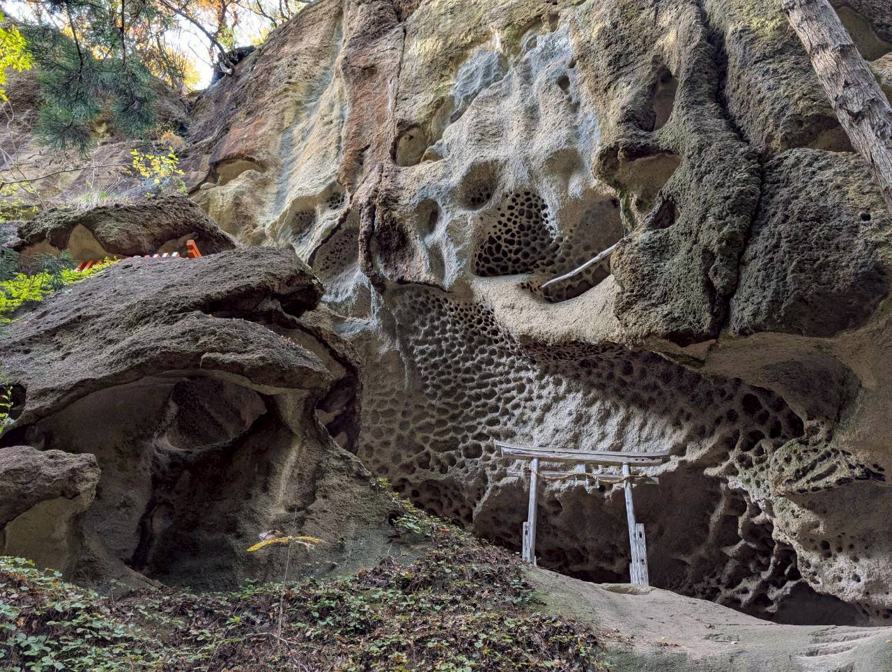 お堂の脇を通り、裏山をひたすら登っていくと、急に景色が変わり、驚くほど幻想的な風景が姿を現します。凝灰岩でできた白い岩肌に、蜂の巣状に穴が開いた巨石・巨岩が複雑に入り組んで並んでいるのです。そこには木製の鳥居や古峯(こぶはら)神社、稲荷神社などの小さな祠(ほこら)が点在し、えも言われぬ光景になっています。初めて行った方はまさか山形市にこんな場所があったのかと感動することでしょう。