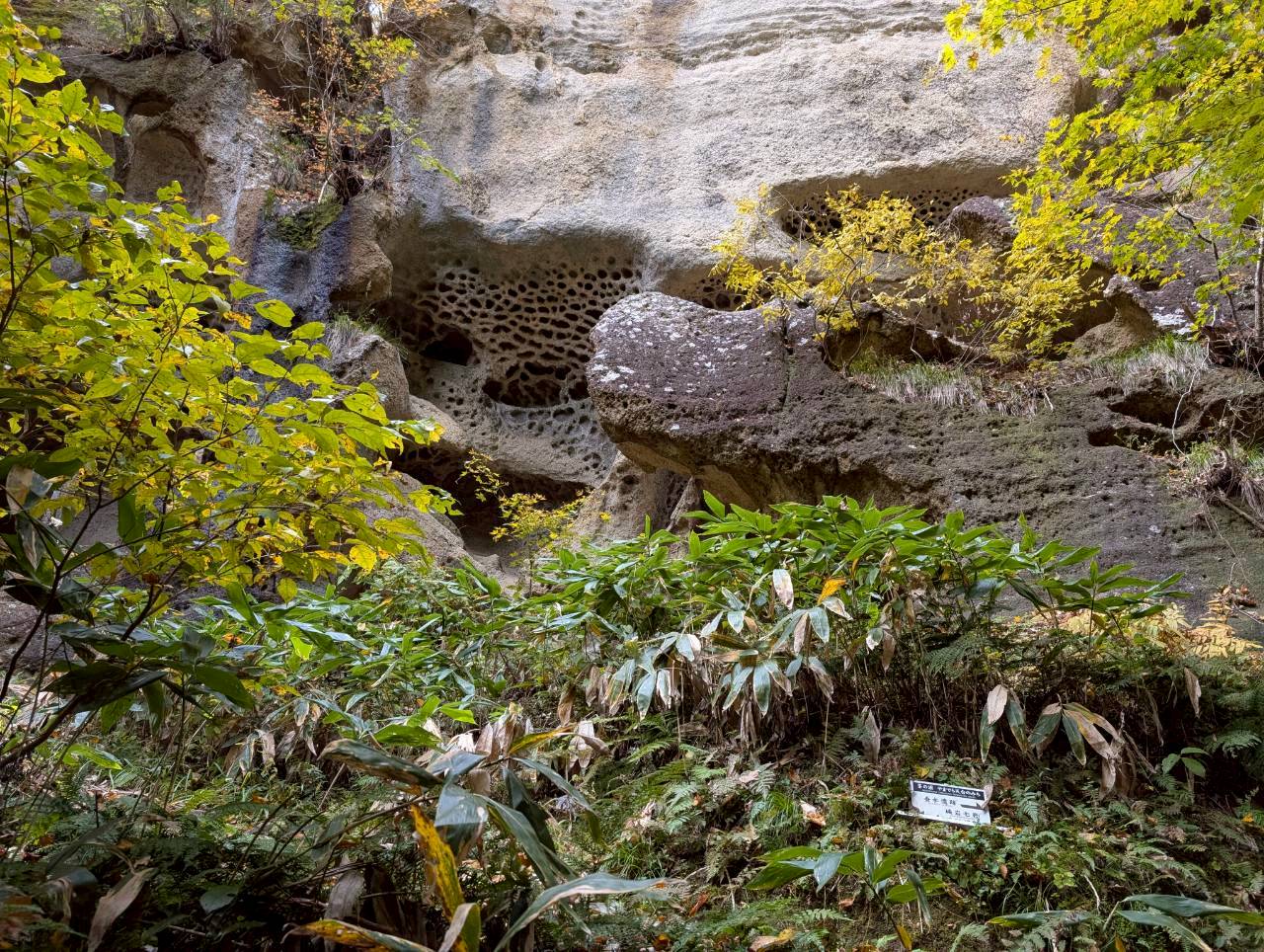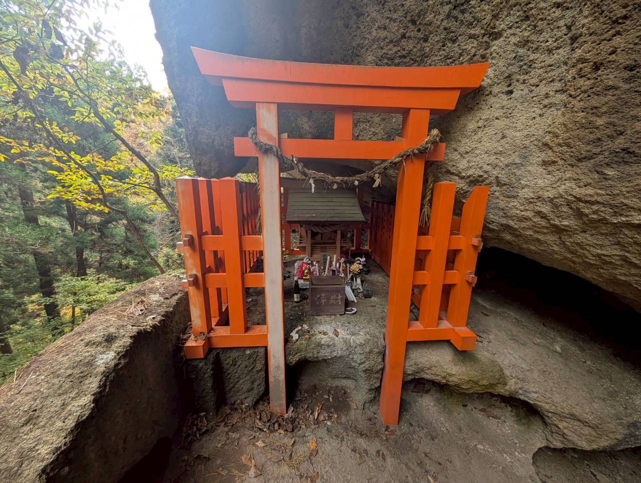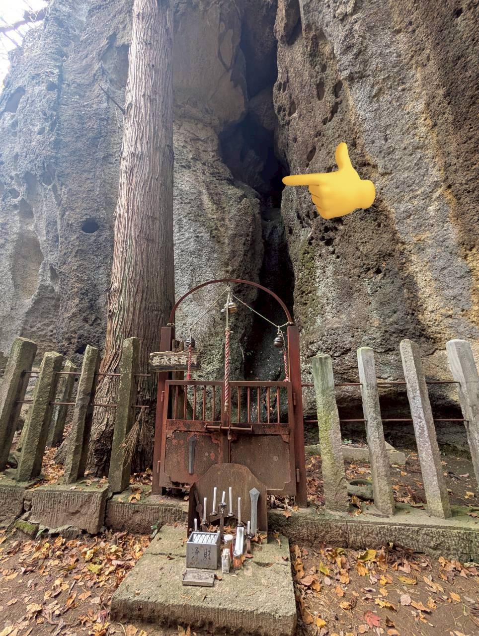 お堂の脇を通り、裏山をひたすら登っていくと、急に景色が変わり、驚くほど幻想的な風景が姿を現します。凝灰岩でできた白い岩肌に、蜂の巣状に穴が開いた巨石・巨岩が複雑に入り組んで並んでいるのです。そこには木製の鳥居や古峯(こぶはら)神社、稲荷神社などの小さな祠(ほこら)が点在し、えも言われぬ光景になっています。初めて行った方はまさか山形市にこんな場所があったのかと感動することでしょう。