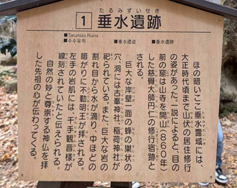 おそらくそれ以前から山岳信仰の拠点として存在したのだと思います。垂水遺跡のほか、烏帽子岩(えぼしいわ)、城岩七岩(しろいわなないわ)、修験場跡など、1時間半ほどで回ることができます。「パワースポット」という言葉がありますが、まさにこのような場所を言うのではないでしょうか。ぜひ一度足をお運びください(ある程度急な山道を登りますので、それを踏まえた装備でお願いします)。