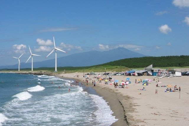酒田共同火力発電所の北側にある海水浴場で、風車が目印です。