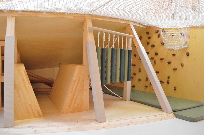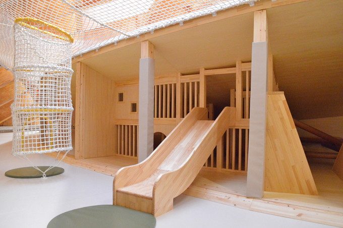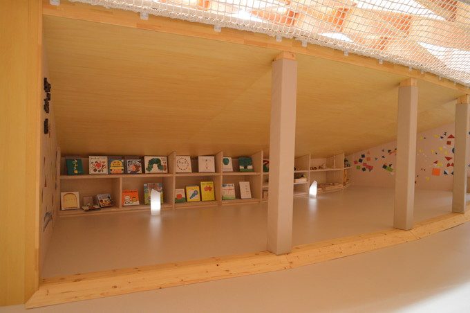 上のすべり台の下はさらに回り込むことができ、絵本などがある小さい子ども用のスペースになっていました。