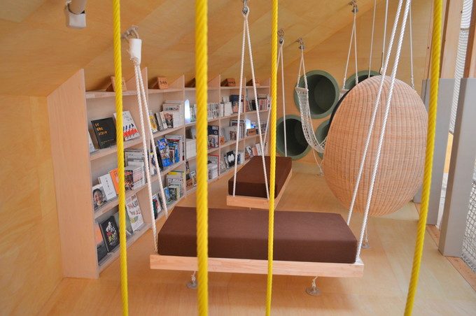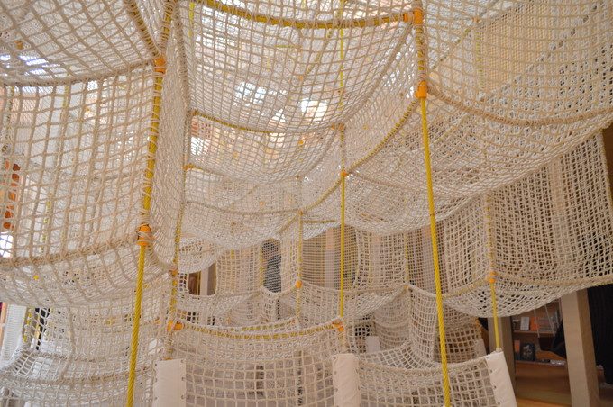 ネットの下側をくぐっていくと奥には絵本などが置いてあり、簡単な読書コーナーになっています。