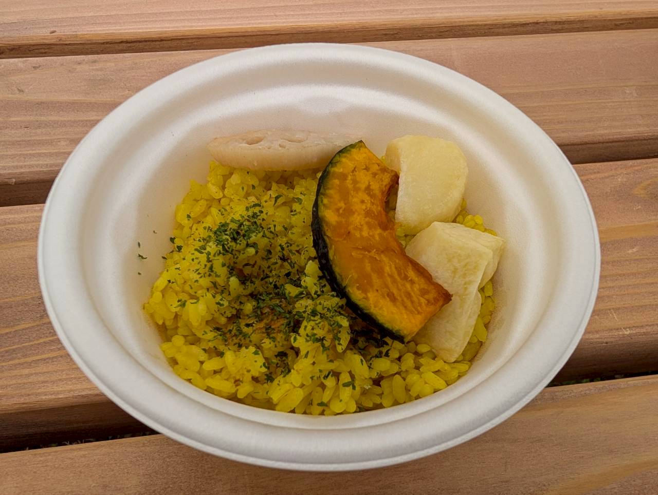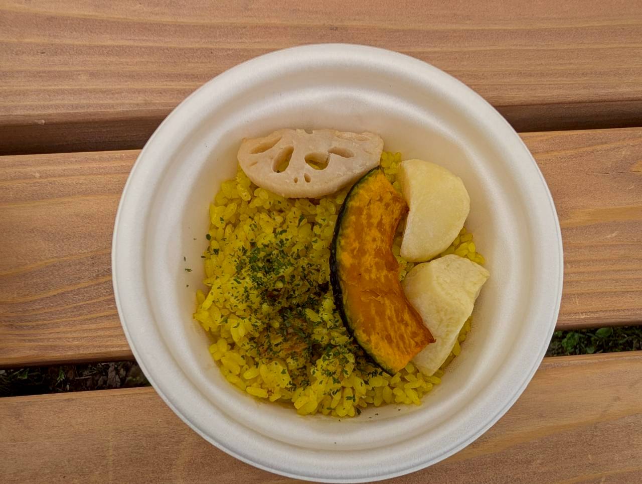 素揚げのジャガイモ、カボチャ、レンコンがターメリックライスの上に載ってます。