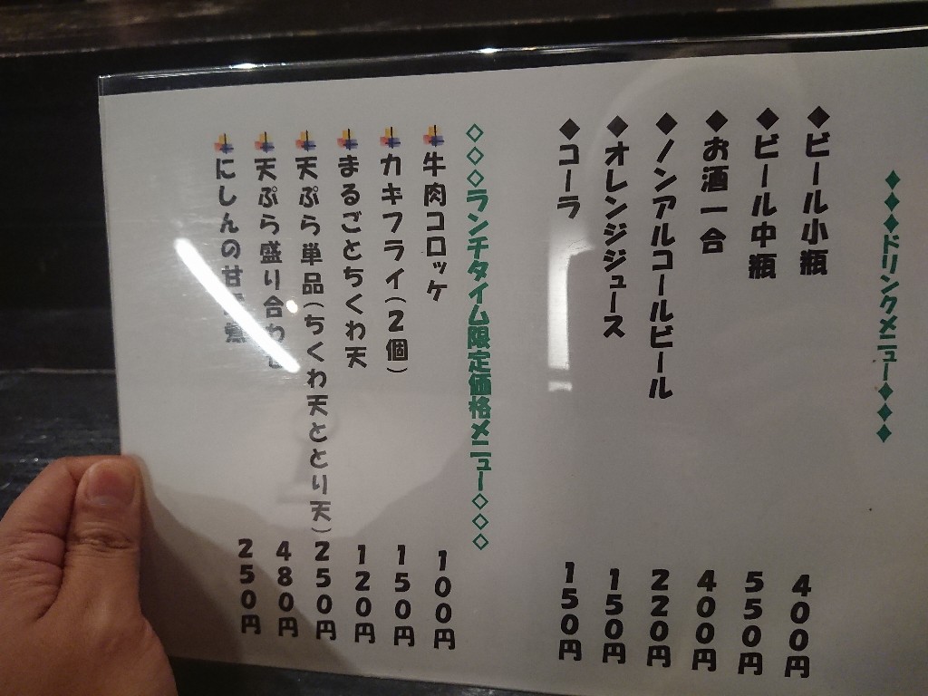 アルコール等のドリンクメニューの他に、ランチタイム限定ですが、牛肉コロッケやカキフライ等がトッピング出来るようで、お蕎麦だけだとちょっと物足りない時に追加で注文しても良さそう。