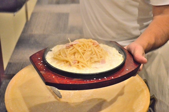 そして北海道レストランの名物が目の前で仕上げてくれるという「巨大ホールチーズのクリームパスタ」です。