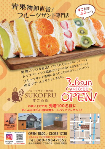 そこで今回は、フルーツサンドでお馴染みの長井市にあるフルーツサンド専門店「SUKOFRU~すこふる~」さんへお邪魔して、シャインマスカットを使った商品をご紹介したいと思います♪