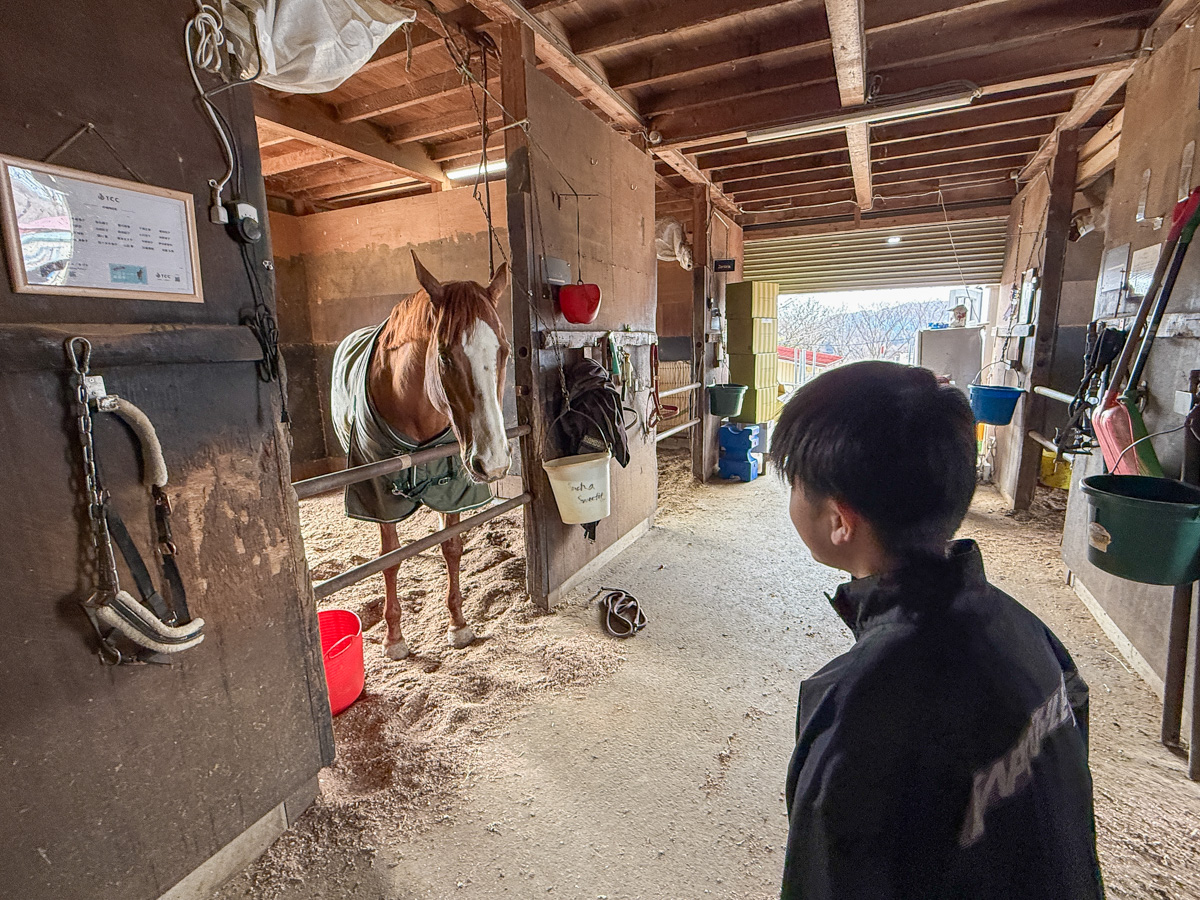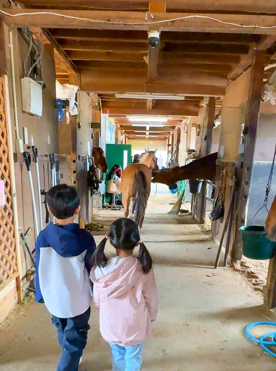 厩舎(きゅうしゃ)へ一歩足を踏み入れた瞬間、子どもたちがピタッとフリーズ。