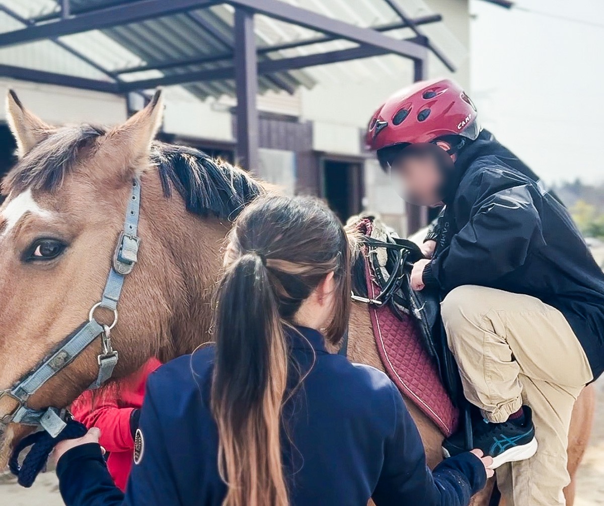 えさやりで少し慣れてきたところで、いよいよ乗馬体験へ。