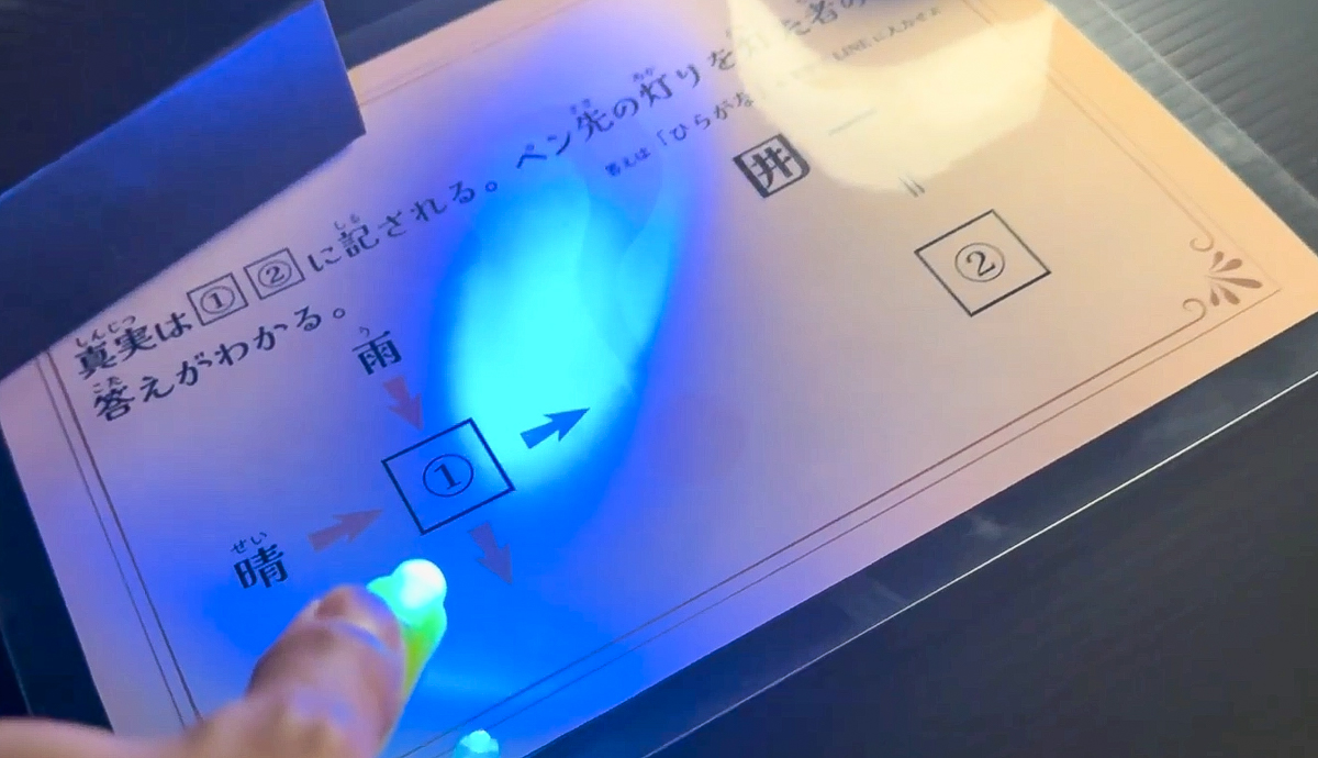 暗闇に隠されたヒントがブラックライトで浮かび上がったり…。