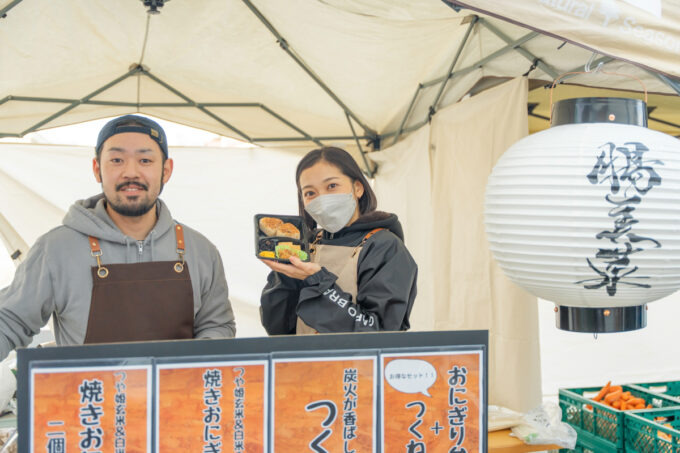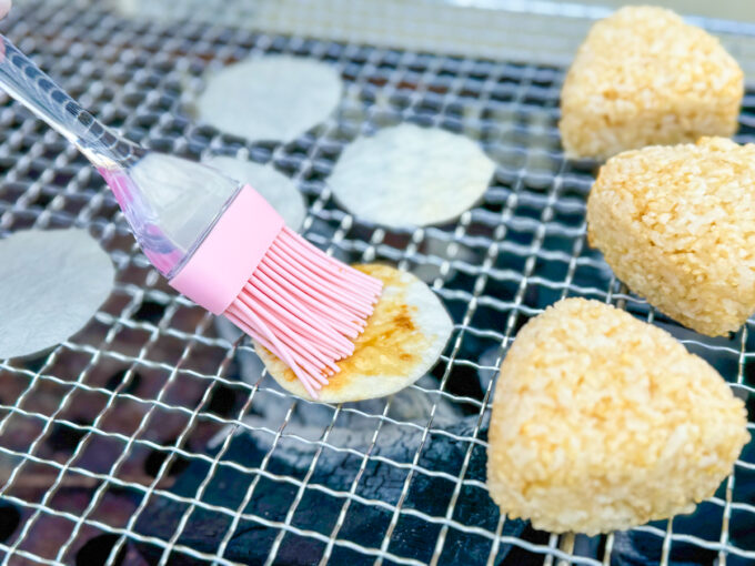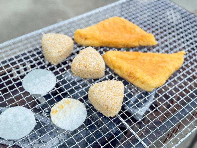おにぎり、せんべい、油揚げを自分で焼いて楽しめる企画で、炭火の香りに味噌と醤油のうまみをのせて味わえます。