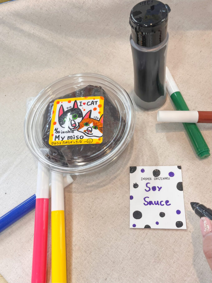 味噌カップと醤油ボトルを、自分だけのデザインで作れる体験で、描いて、貼って、食卓で使えるオリジナル容器を完成させます。