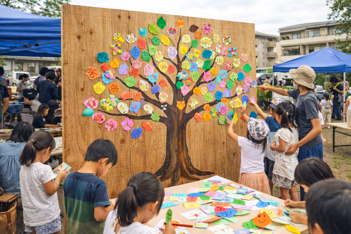 葉っぱや花に見立てた紙にお絵描きをして貼り、みんなで一本の木を完成させる参加型企画です。