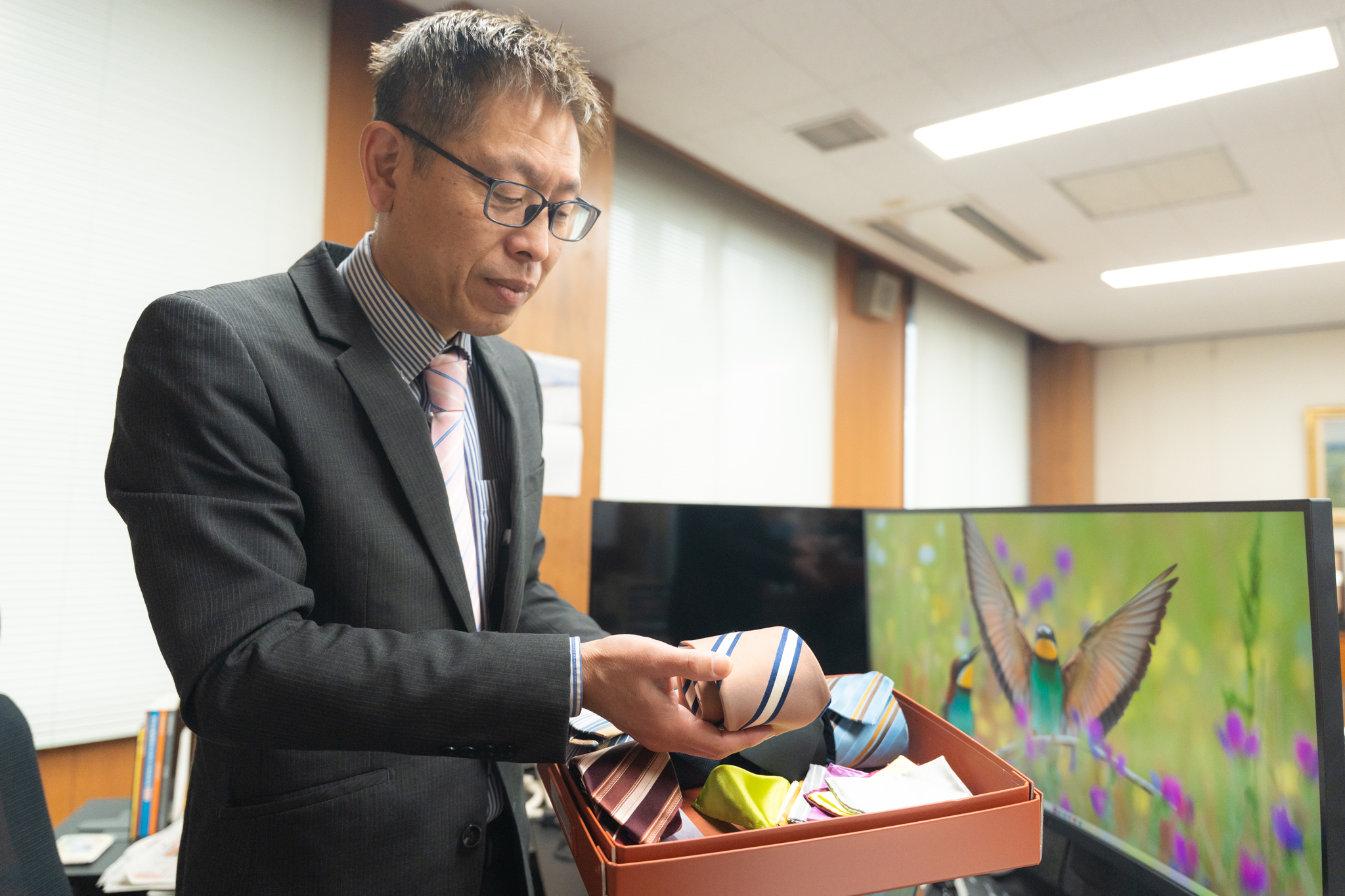 ご覧ください!当時の局長の胸元には、確かにこの紅花色のネクタイが!