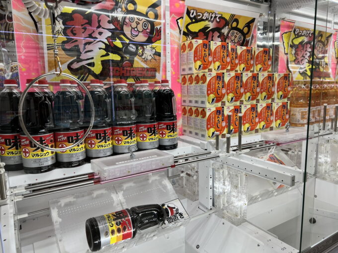 金のクレーン内に並ぶ豪華景品は、見ているだけでもテンションが上がること間違いなし。