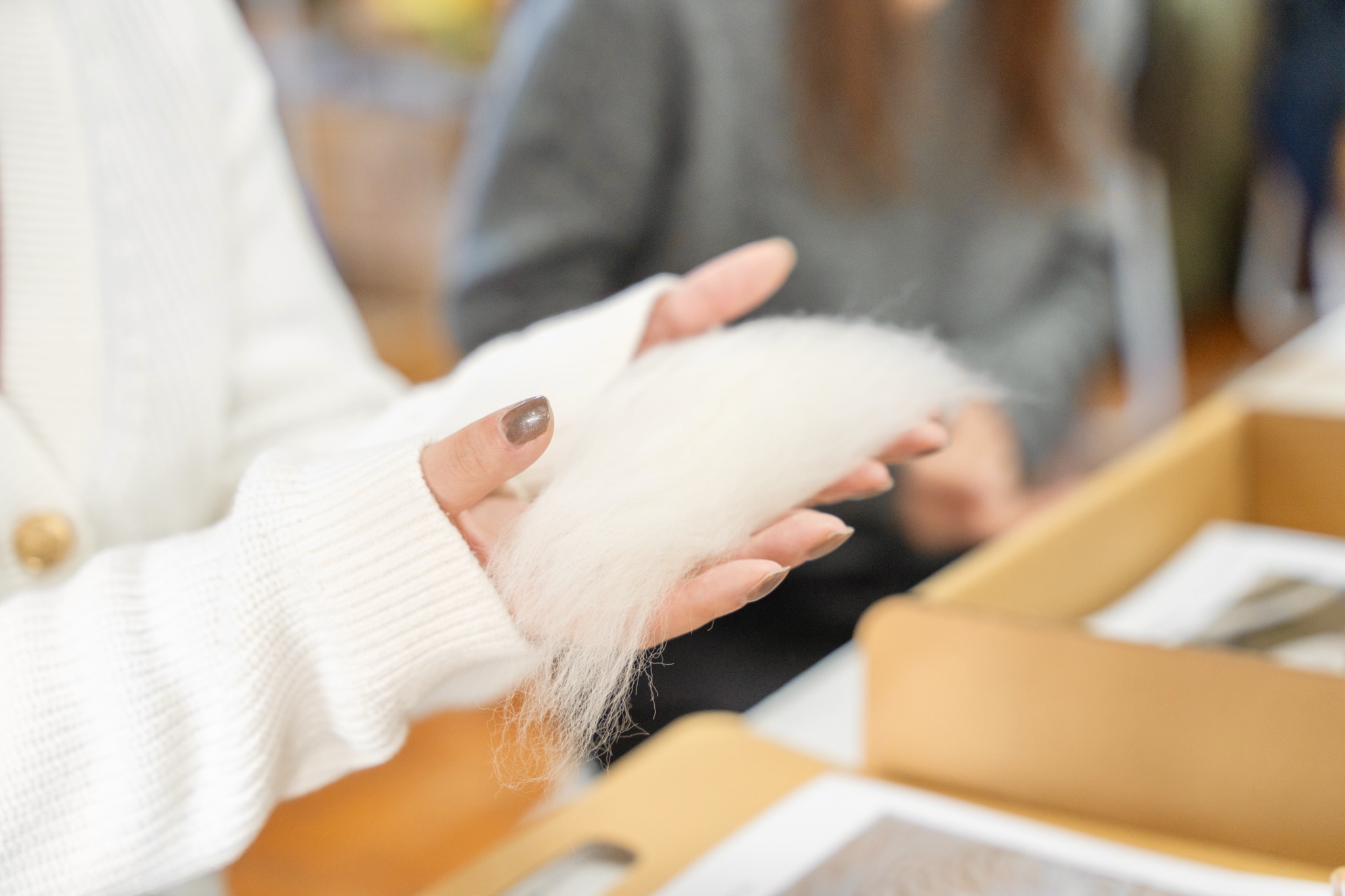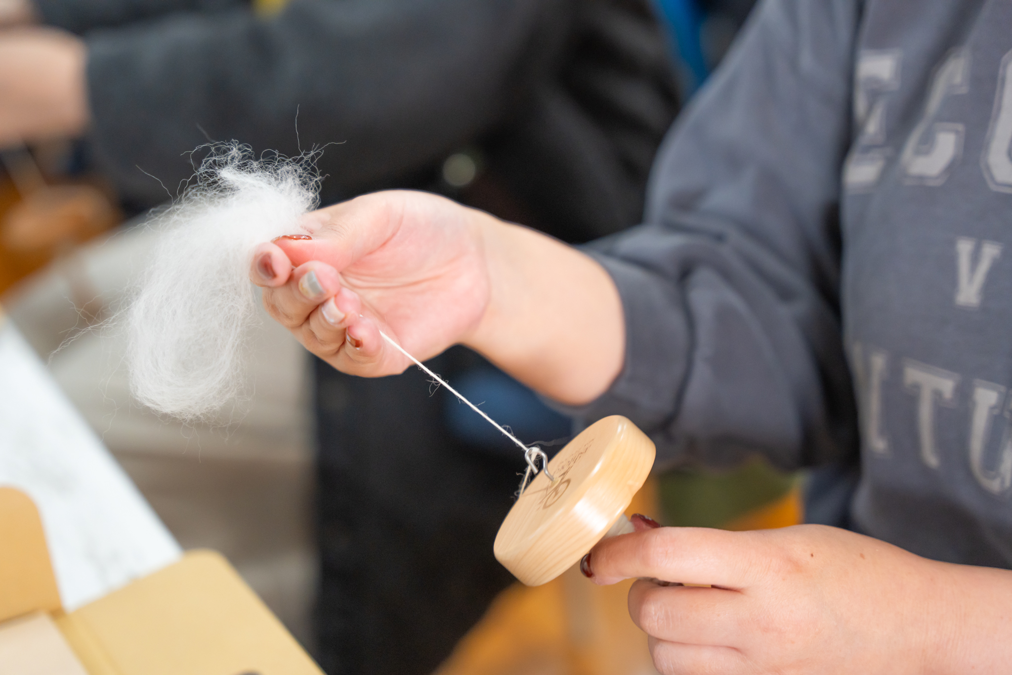 羊毛から自分の手で1本の糸を紡いでいく体験です。